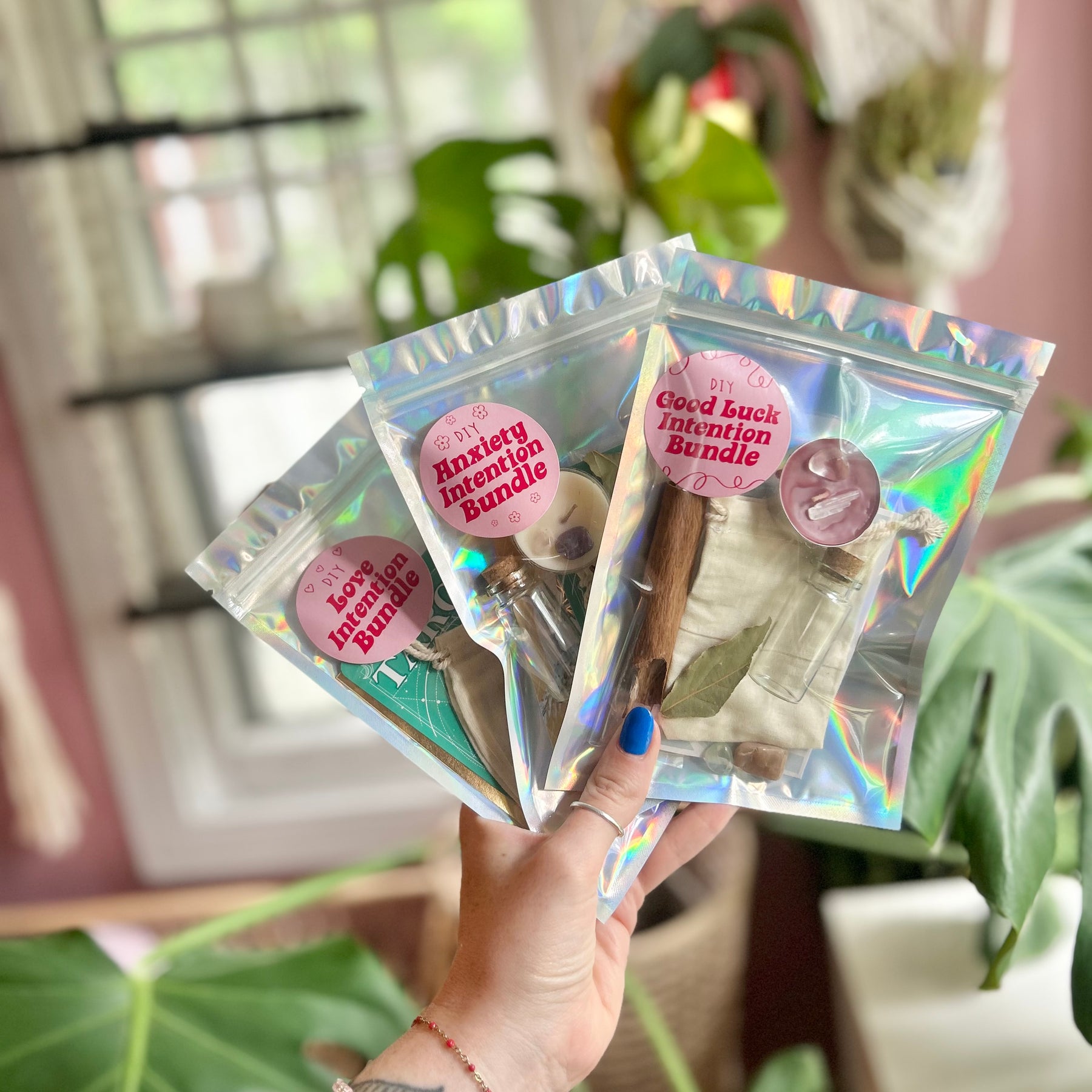 Instructions : Find a cozy spot at home, light your Tealight candle in a safe, well ventilated area. Once your candle is burning take your slip of paper and focus on what intention you want to set. Whether it’s loving yourself more, finding good luck, or lessening your anxiety. Write in present tense what you want. For example : “I am loved”. When finished fold your paper and place it inside your intention bag. Once finished take each item and place it inside the bag. You can add a little to your enclosed jar as well. When finished seal the bag up and place it somewhere - under your pillow, in your purse or even hanging near your front door. Allow the Tealight to burn until empty - you can use a bit of wax to seal your jar but be careful!