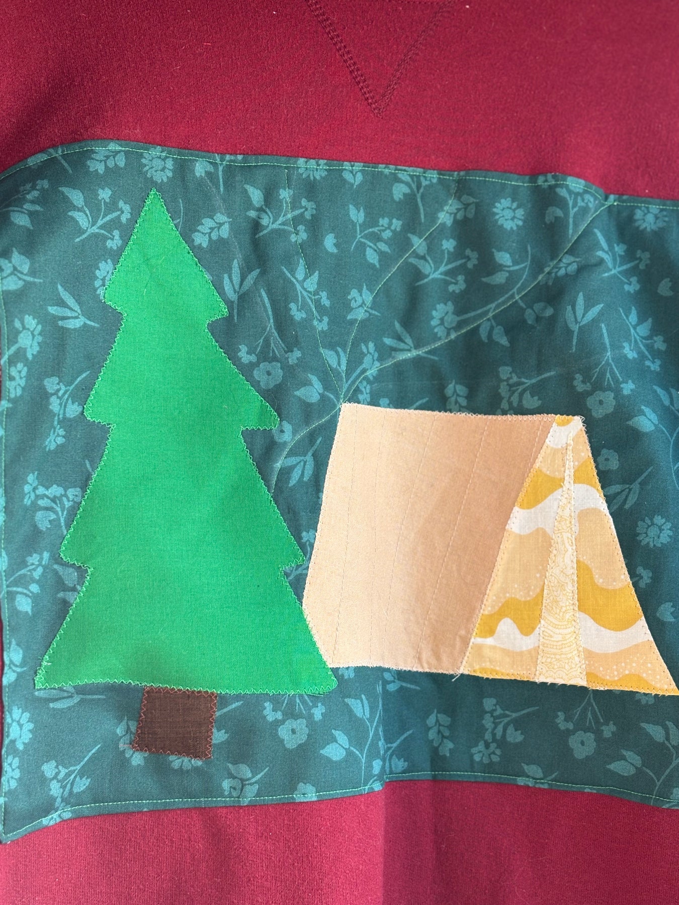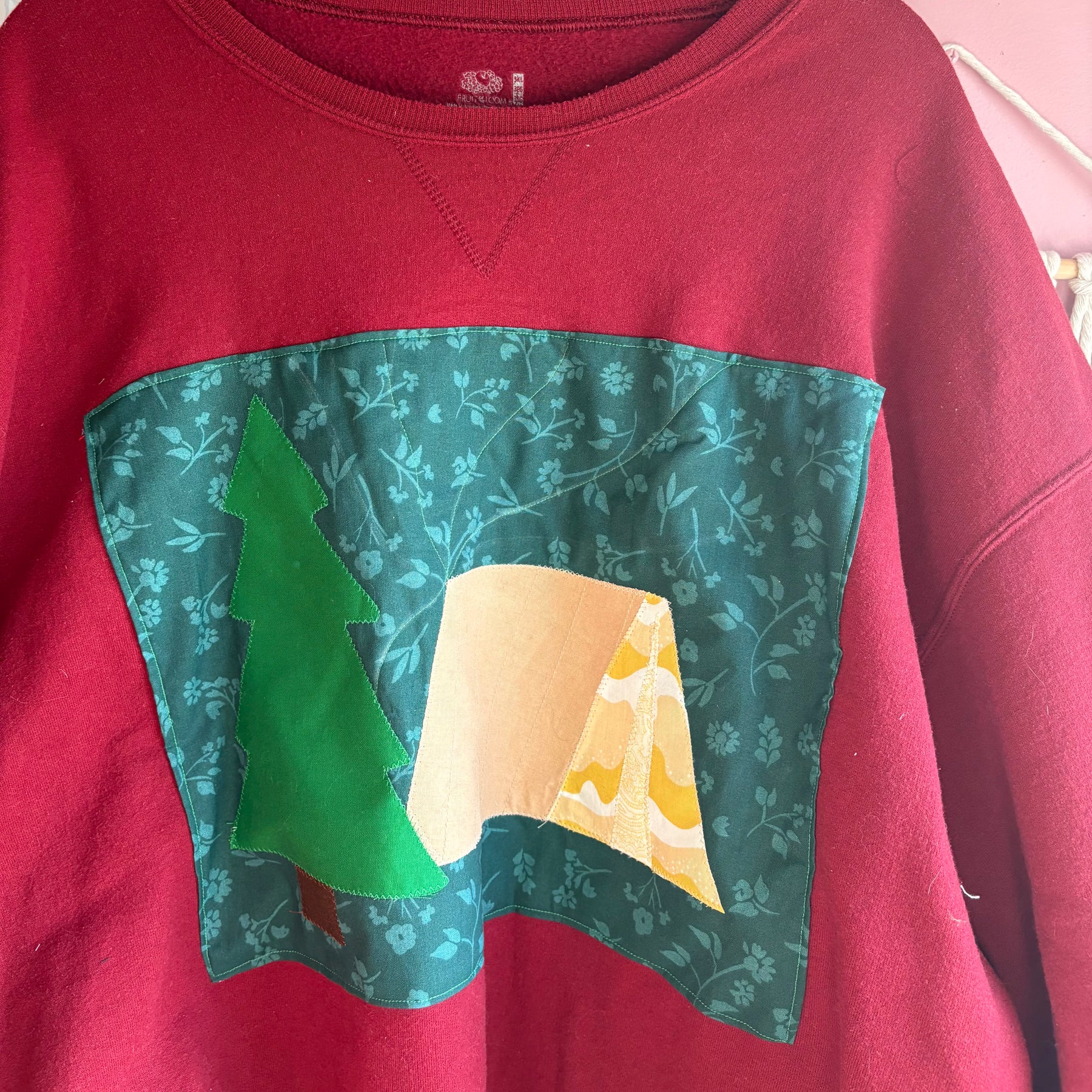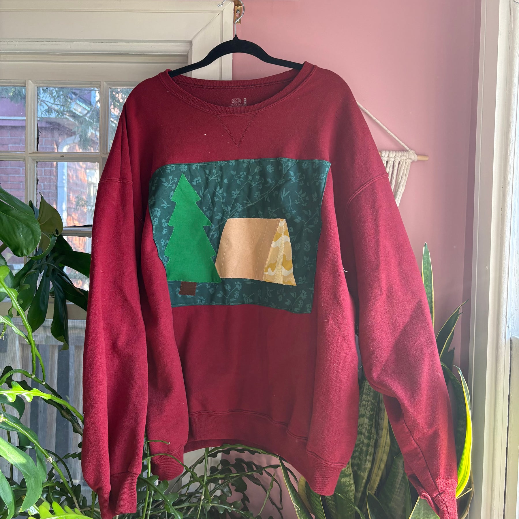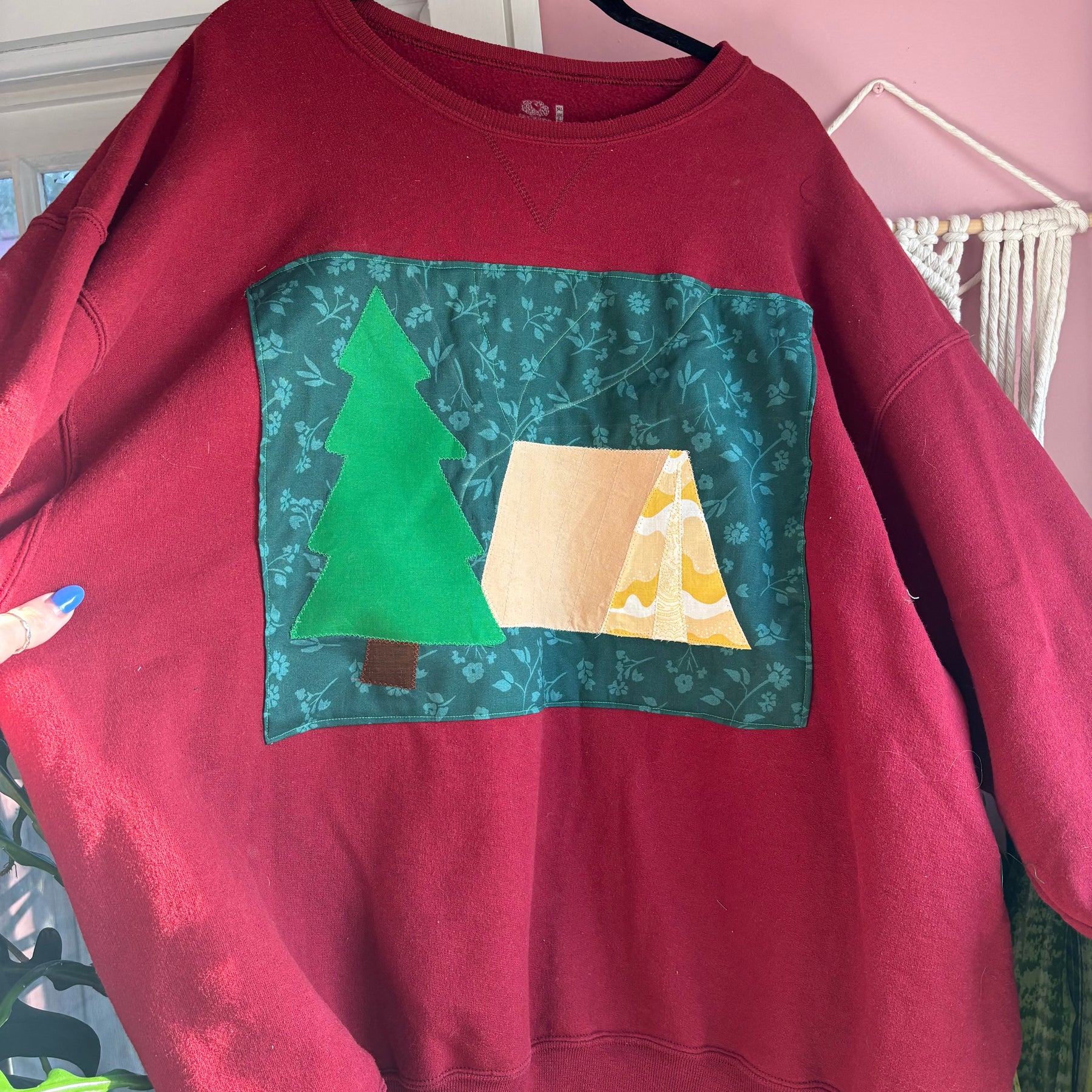 A Fun camping tent appliqué made from our scraps! Sewn onto a thrifted sweater size 3XL fruit of the loom pit to pit 28” shoulder to hem 29”