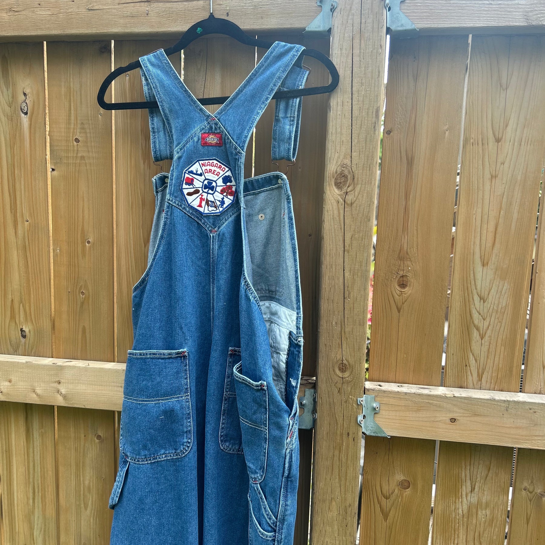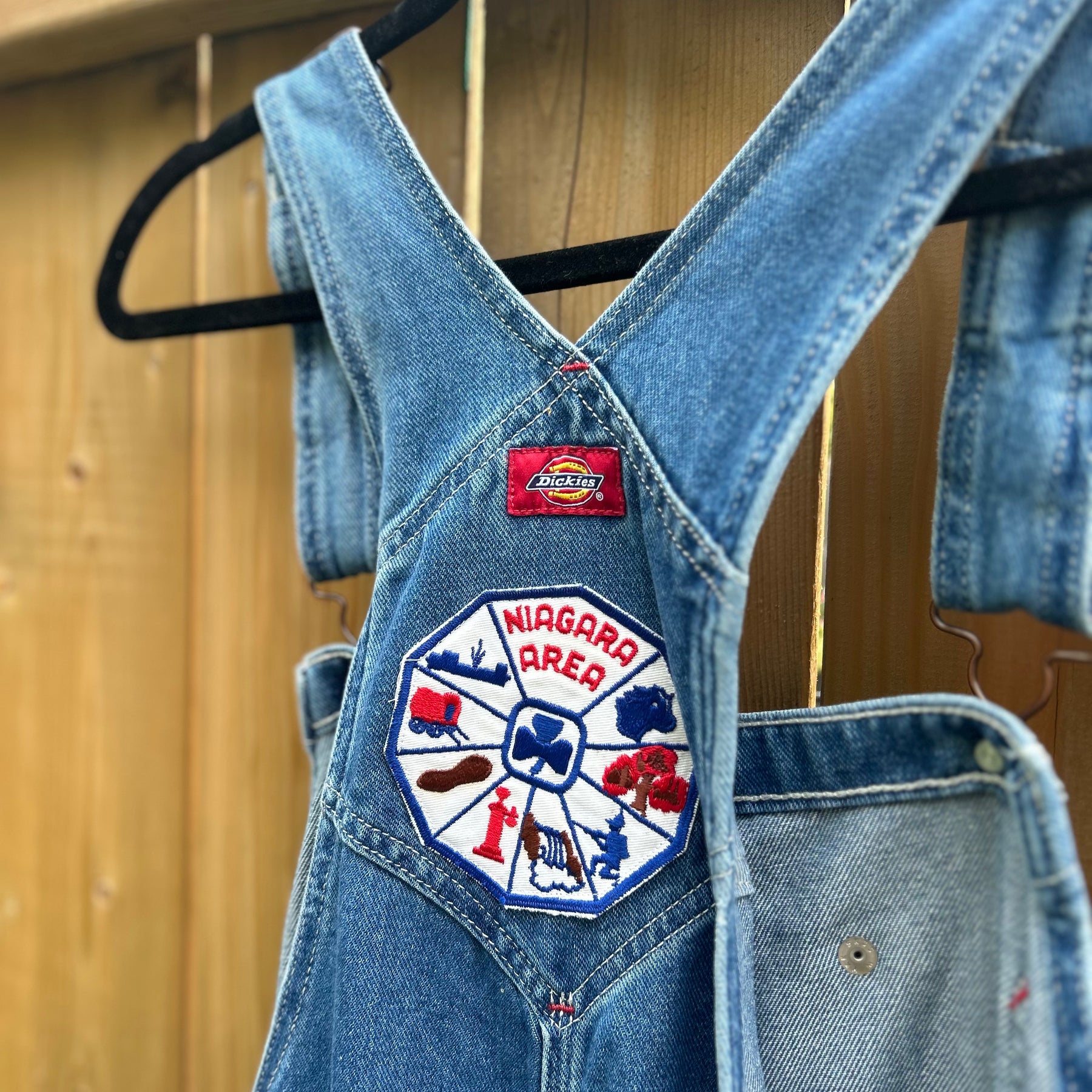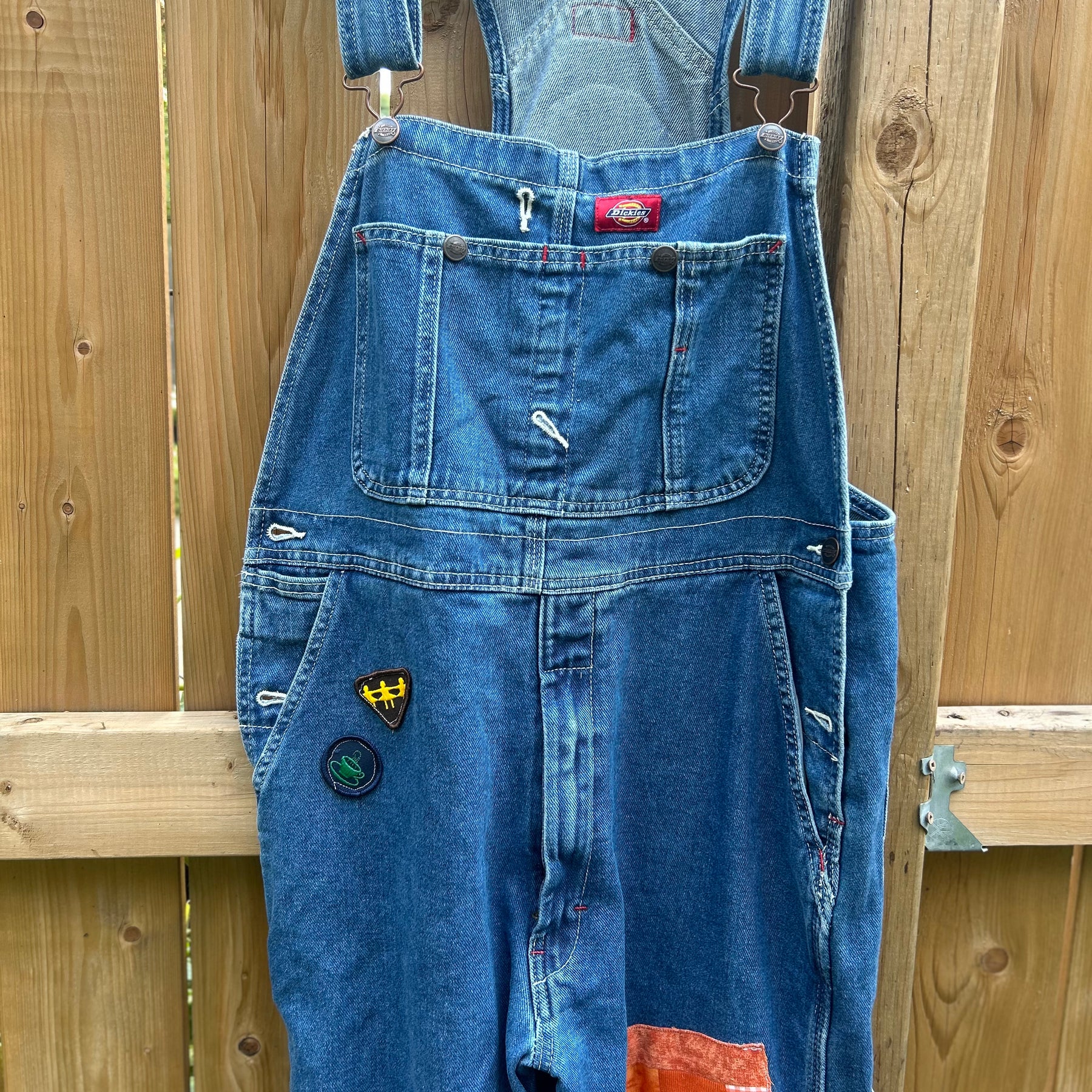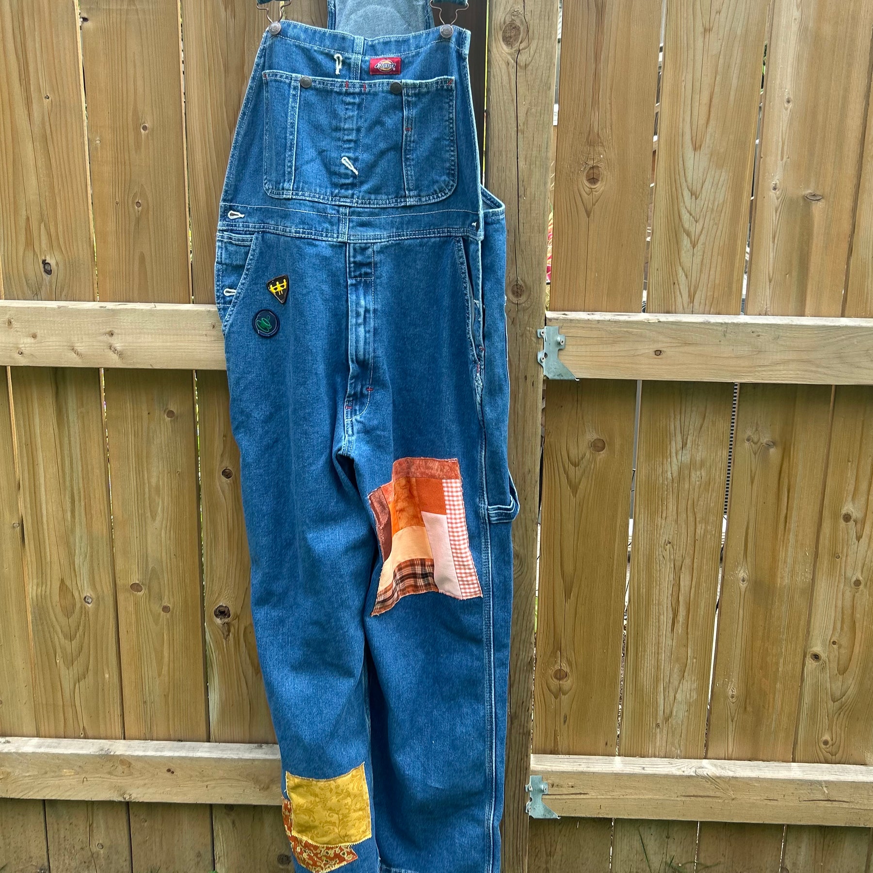 Dickie's overalls with patches - size 32x30. Features a quilt square and girl guide patches
