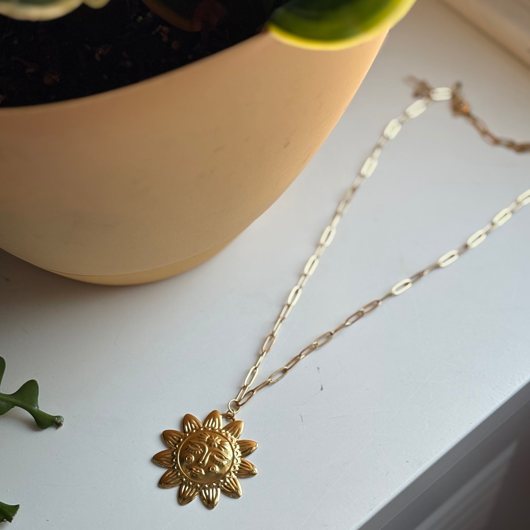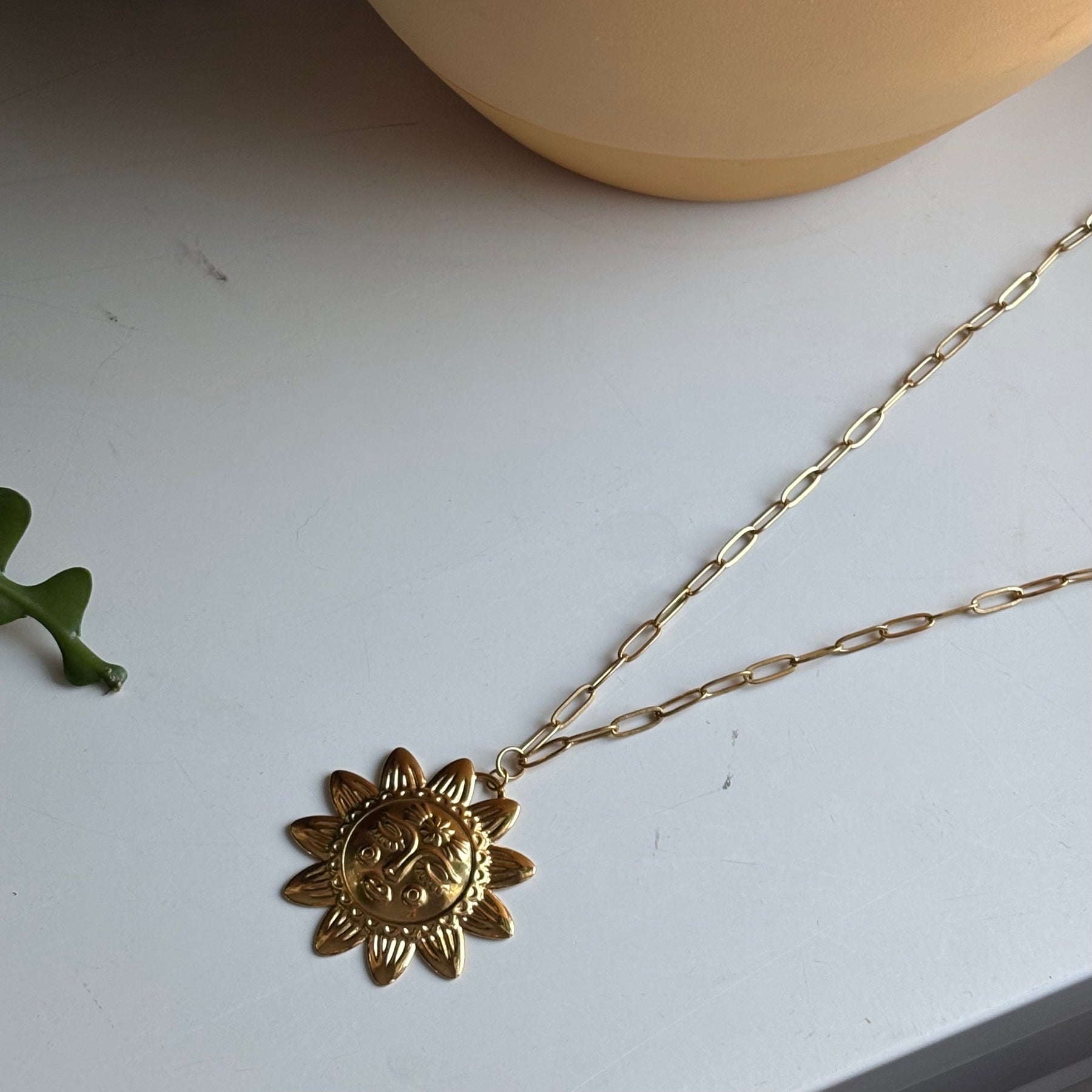 A gold plated stainless steel sun charm on a long adjustable stainless steel chain. Can be worn 16-22” in length. Safe in water. Avoid chlorine and chemicals for longest life