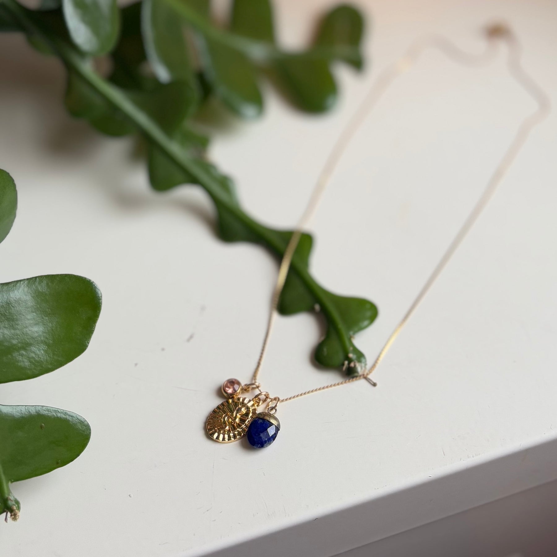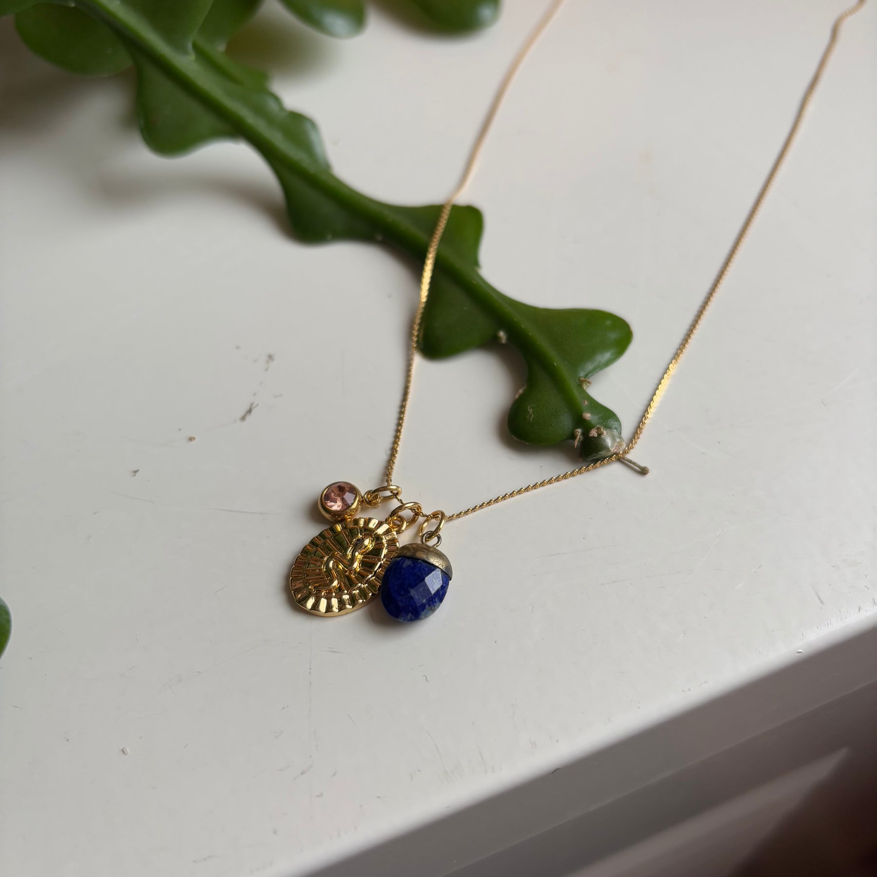 Necklace features a gold plated stainless steel chain 16-18” in length. It has a lapis lazuli stone pendant, and a snake charm. It’s safe to wear in water but avoid chlorine and chemicals for its longest life