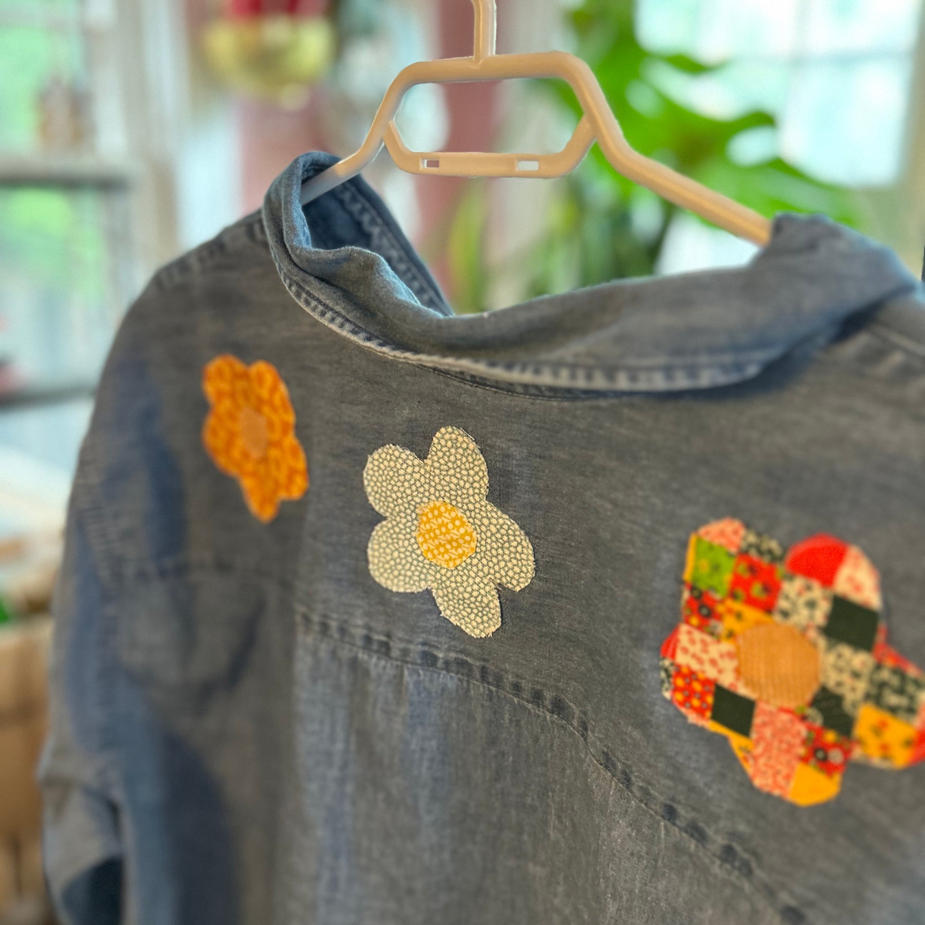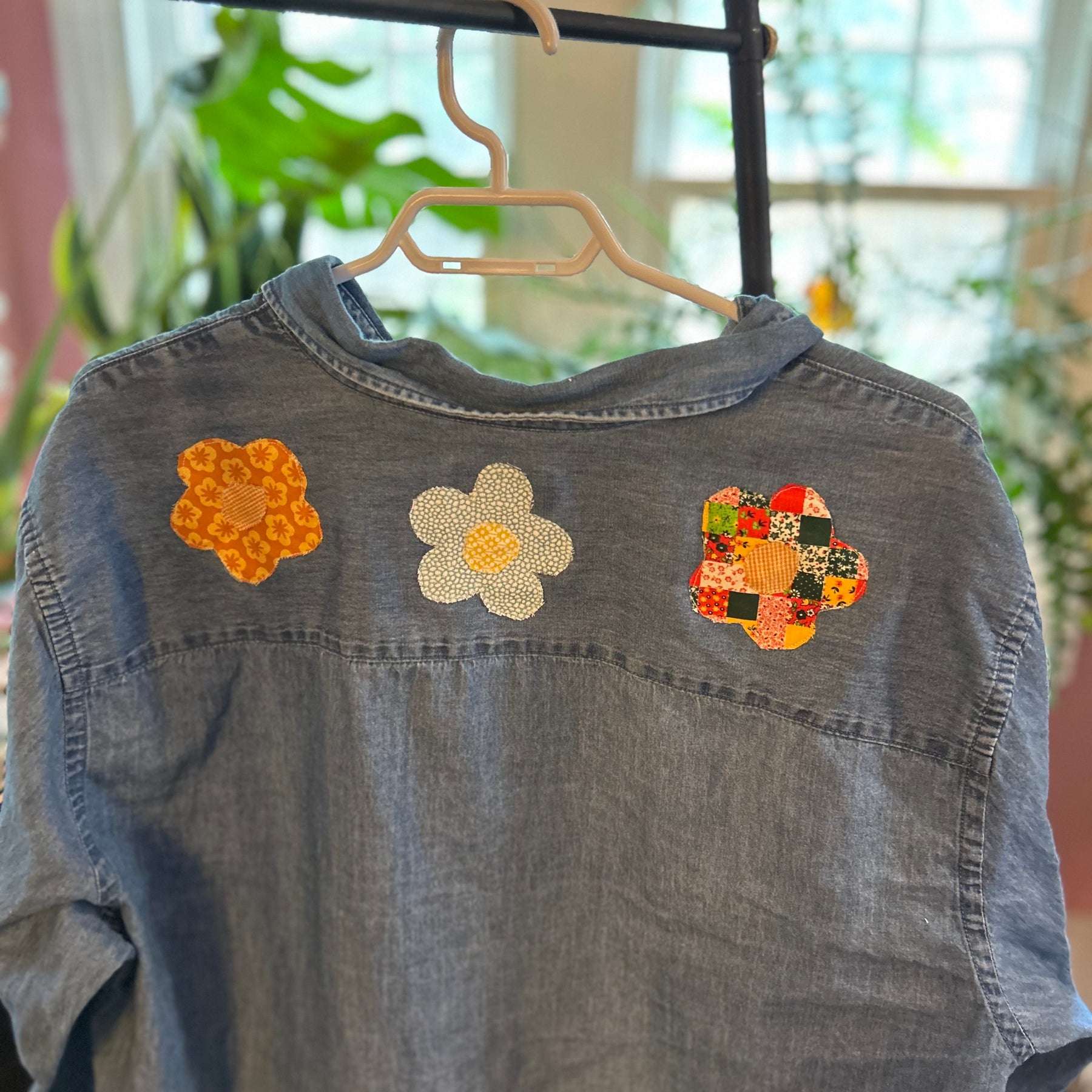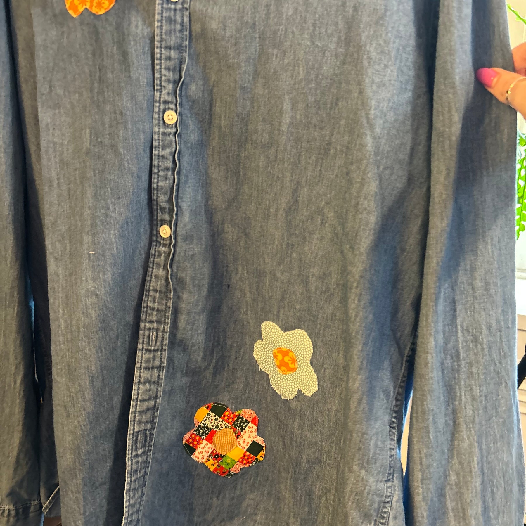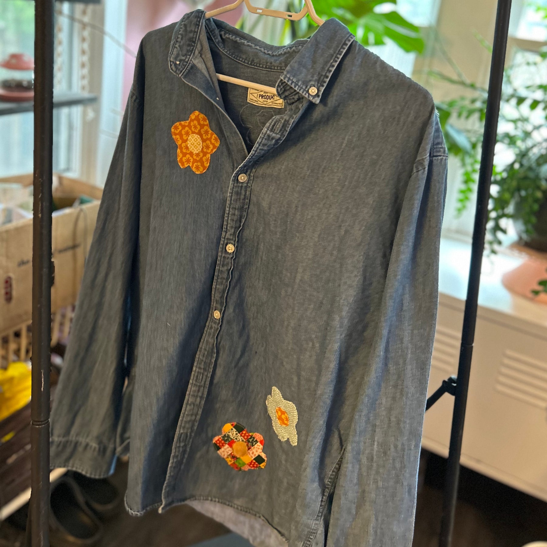 This item is an Upcycled piece from a thrifted shirt carefully selected for their patterns & uniqueness. Each piece is one of a kind, sustainable and eco-conscious.